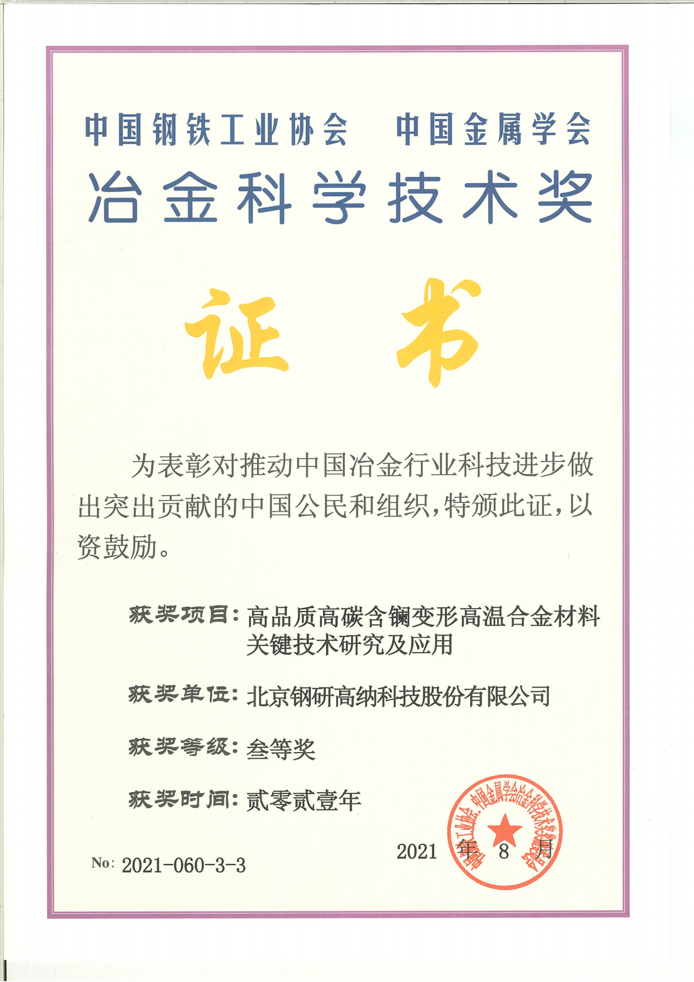 中國鋼鐵工業(yè)協(xié)會(huì) 中國金屬學(xué)會(huì) 冶金科學(xué)技術(shù)獎(jiǎng)