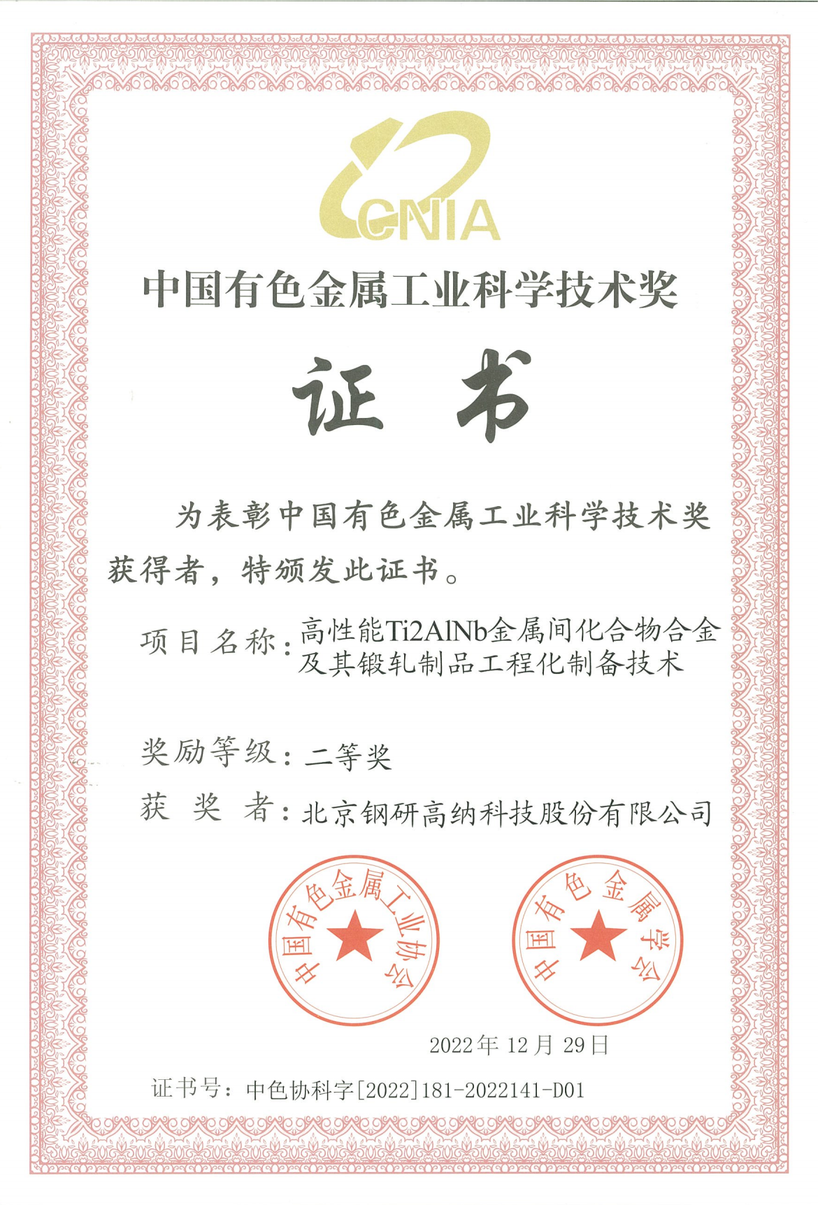 中國有色金屬工業(yè)科學(xué)技術(shù)獎(jiǎng)